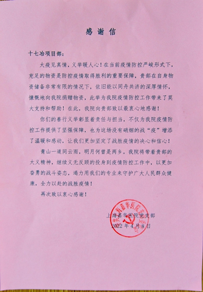 病毒可以被隔离,但温暖不会被隔离。4月8日,上海嘉华医院向中国十七冶集团上海分公司菊园项目部发来感谢信,对项目部在本轮上海疫情防控工作中向嘉华医院捐赠生活物资这一举动表示感谢,对十七冶员工在防疫一线展现的志愿服务精神表示充分肯定和高度赞扬。