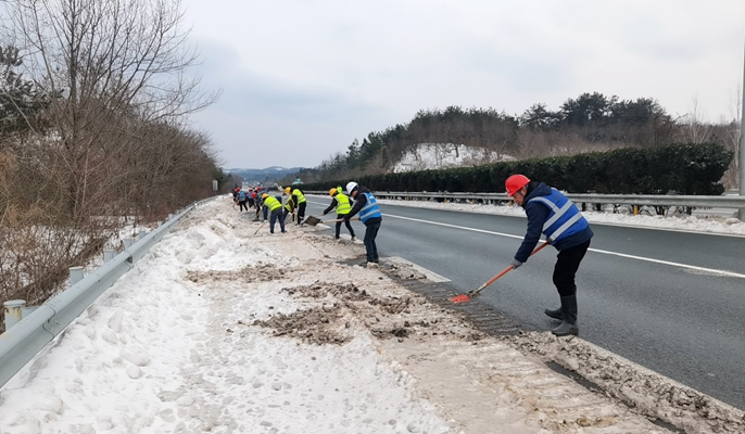 风雪过后,路面打滑难行,许广高速三阳段积雪造成交通阻断。2月22日上午,得知消息后,项目部迅速筹备3吨融雪剂,紧急组织60名管理、作业人员,8台平地机、推土机、装载机于中午12时抵达积雪路段,开展路面清扫、撒盐化雪、摆放警示标识等作业。过程中,党员干部与团员青年齐心协力,对长下坡、弯道等重要路段驻点巡查,排查安全隐患,努力将低温雨雪天气的不利影响降到最低。截至2月23日上午9时,项目部已完成许广高速三阳段除雪破冰作业超15公里,作业还在持续推进中。