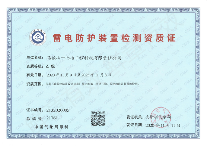 11月16日,十七冶工程科技公司获批安徽省气象局颁发的雷电防护装置检测乙级资质证书。